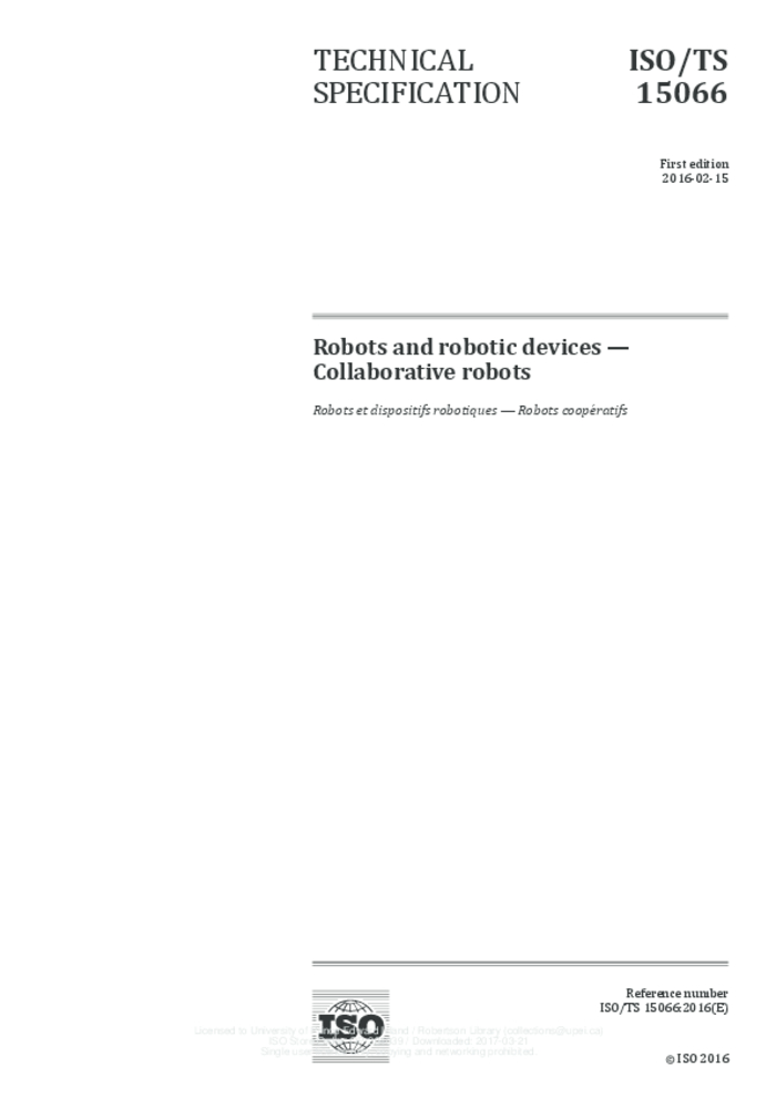 ISO/TS 15066:2016(E) Robots and robotic devices — Collaborative robots